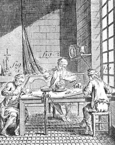 The picture on the left depicts a 17th Century workshop, showing tools and techniques that have changed little through the centuries. Many of the tools and bench are still recognisable workshop today. On the right a Silver Salver with foot, Kinsale, 1710 |