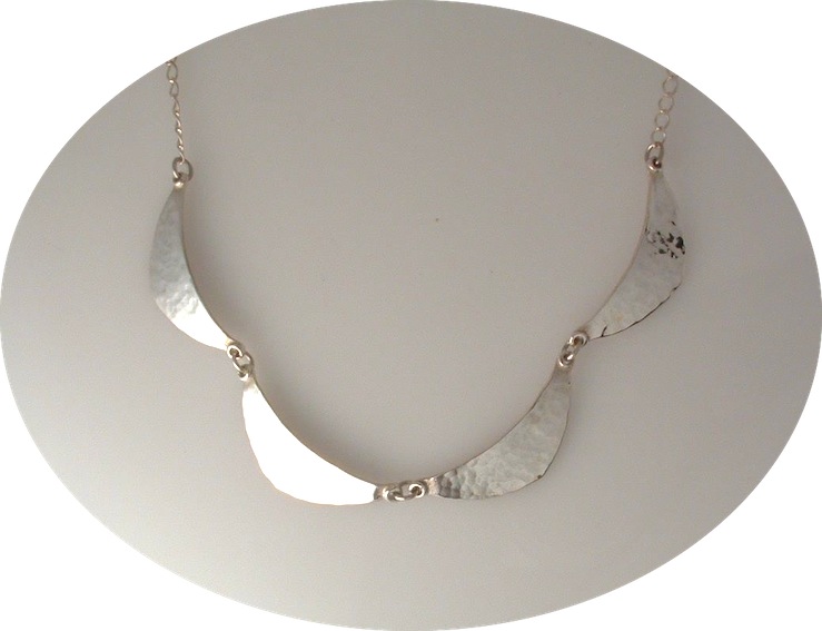 Four piece necklace Four hammered pieces, linked on a chain make this simple but striking necklace. Size..........8ins (hammered segments. |