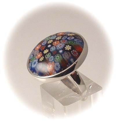 Inch ring. Set with Murano glass millefiore on the left and goldstone on the right. Price, €65 |